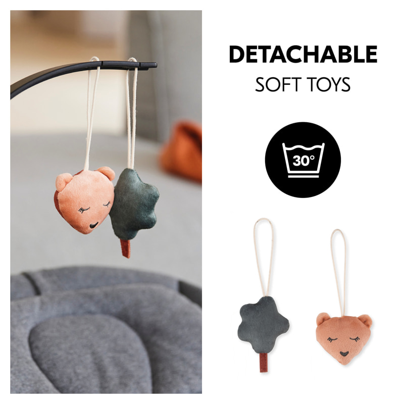 Двете меки играчки са просто прикрепени към арката за игра и могат да бъдат премахнати по всяко време за пране. Толкова практично.