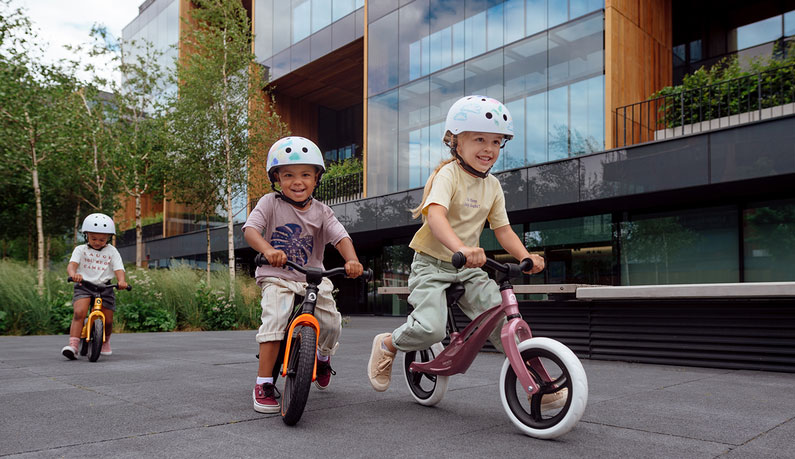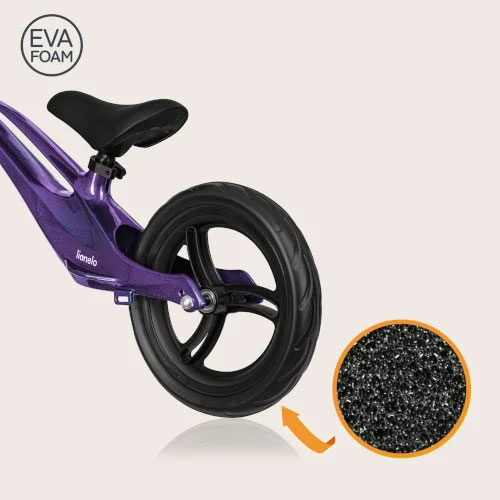 Безкамерните гуми от EVA пяна осигуряват плавно возене без необходимост от помпане. Леката рамка от магнезиева сплав с ограничител на завиването гарантира лесно и безопасно управление, а заоблените ѝ ръбове повишават безопасността и намаляват риска от одрасквания. Вградената ергономична дръжка улеснява пренасянето на колелото – практично решение за разходки и пътувания.