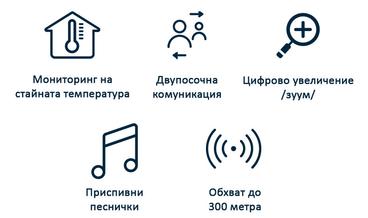 2,8-инчовото стилно преносимо родителско устройство има две индикаторни ленти за нивото на шума, така че никога да не се притеснявате, че не чувате бебето си. Помогнете на вашето бебе да заспи с приспивни песни, успокоите го с функцията за двупосочна комуникация и разберете дали стаята му е твърде гореща или твърде студена с мониторинг на стайната температура.