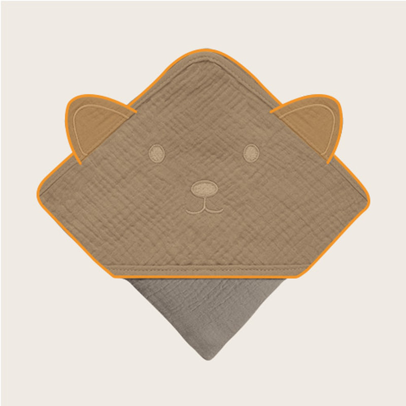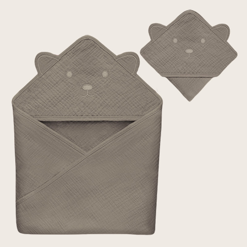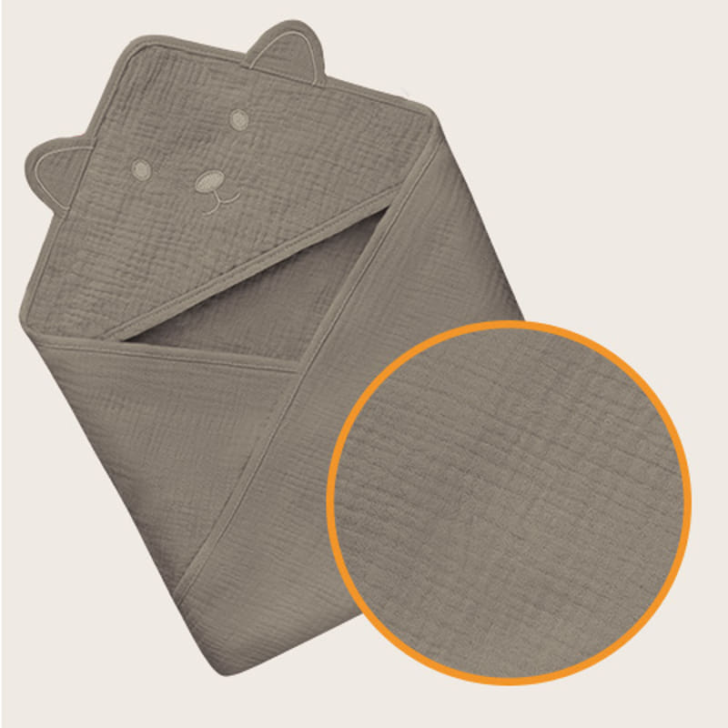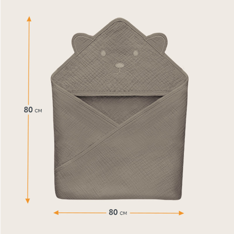 Изключително мека и приятна на допир бебешка хавлия с качулка, която е изработена от 100% памучен муселин. Тя осигурява нежно и леко усещане, което стимулира сетивното възприятие на детето. Освен това муселинът е дишаща материя, която ефективно отвежда влагата и е напълно безопасна за чувствителната бебешка кожа, без да предизвиква раздразнения. Качулката с везана мечка защитава главата от студ и течение, а самата хавлия създава положителна връзка с ежедневното къпане. Благодарение на универсалния си размер, хавлията е подходяща както за новородени, така и за по-големи деца, които вече ходят.