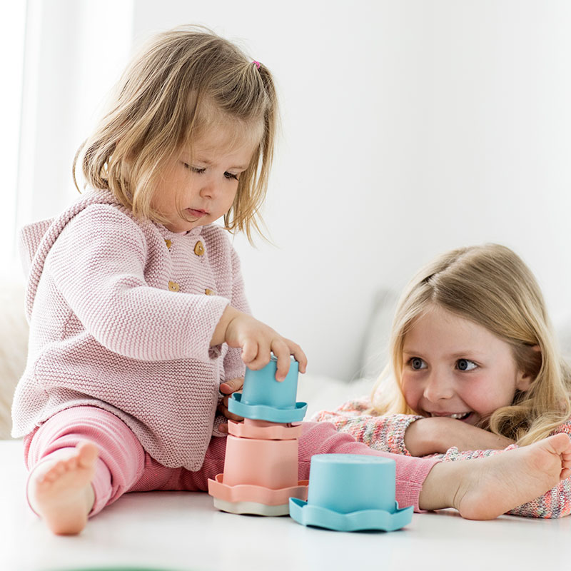С цветните чаши с форма на цветя малките деца ще правят своите първи опити с различни форми. Чашите за подреждане могат да се използват за изграждане на кула с височина от приблизително 30 см.
