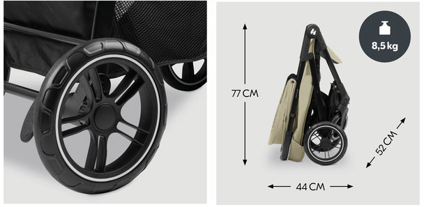 С тегло от едва 8.5 кг и гуми, устойчиви на спукване, количката е изключително удобна както за градски условия, така и за пътувания. Сгъва се с една ръка за секунди.