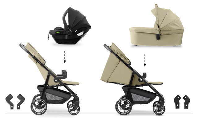 С включените адаптери, кошът и столчето за кола се монтират директно върху шасито на количката. Получавате готова система за пътуване за секунди – бързо и лесно.