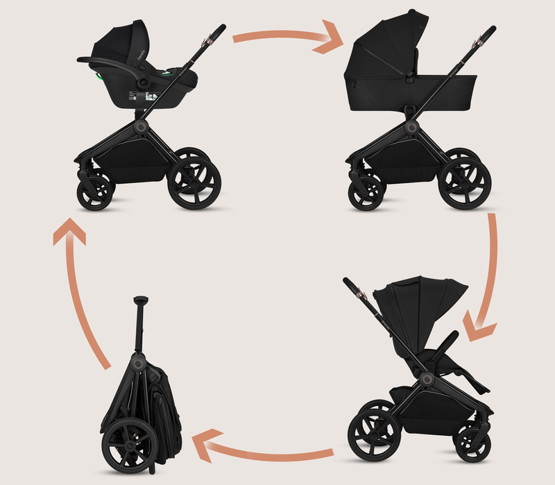 Freya 3-в-1 е решение от първите дни до около 4 години (22 кг). Кошът, седалката и столчето за кола растат заедно с детето.