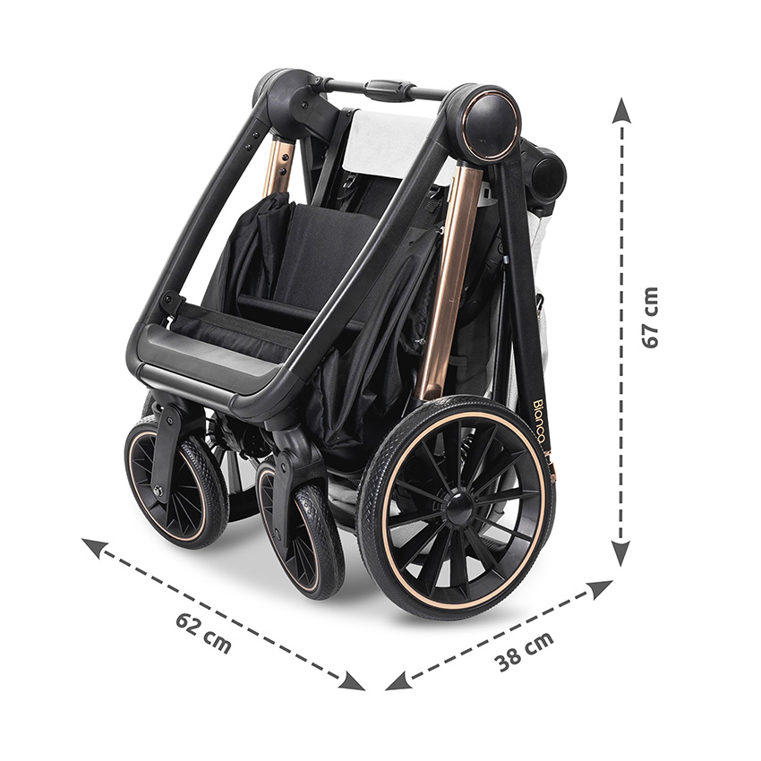 Алуминиева конструкция, голям кош за пазаруване, отстраняем предпазен борд, задни колела със синхронизирана спирачка, раница за аксесоари, регулируема облегалка с механизъм - 3 позиции, завиващи предни колела, регулиране на стъпенката, прозорче на сенника, дръжка от еко кожа, 3 позиции за регулиране на раменните колани, регулируем сенник с козирка, износоустойчиви гуми PU, покривало с прозорец за наблюдение, реверсивна седалка, покривало за крачета, алуминиева дръжка за носене, пружини за обиране на вибрациите при движение, дръжка за носене, регулируеми презрамки, каишки с кукички, за закачане към количка, два странични джоба за аксесоари и мокри кърпи , цип към широко вътрешно отделение, вътрешни джобове, регулируема облегалка за главата чрез механизъм