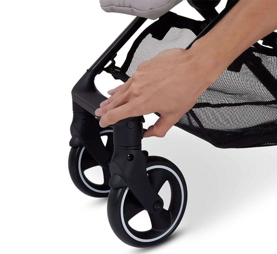 Въртящите се на 360° предни колела правят Ping 3 Travel изключително маневрена. Можете да я управлявате с лекота навсякъде – сред гъсти тълпи на перона или по тесния пътнически ръкав към самолета. При нужда колелата могат да се заключат от движение настрани, така че количката да се справя с всякакви маршрути заедно с вас.