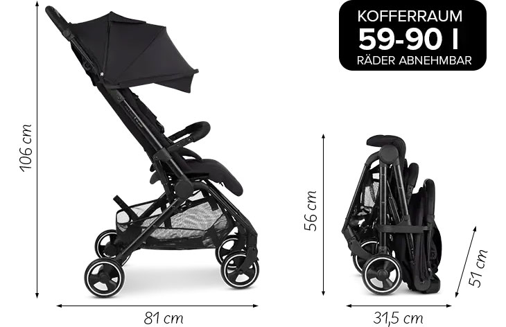 Автоматичната транспортна ключалка предотвратява нежелано разгъване на количката. Когато е сгъната, количката може да се носи с дръжката или удобно през рамо с презрамката за носене. Благодарение на функцията за самостоятелно стоене, количката остава изправена дори в сгънато състояние. Ако не ви е нужна в момента или искате да я защитите по време на пътуване, можете просто да я съхранявате в практичната транспортна чанта (включена).