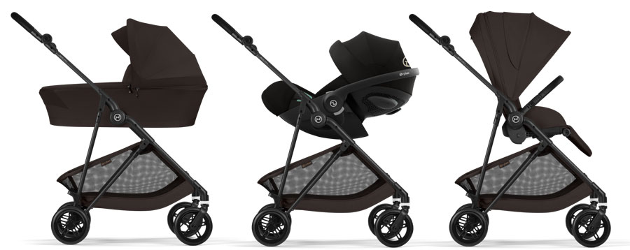 Една количка, три начина за разходка. Прикрепете кош за новородено Melio, столче за кола (група 0+) или седалка, за да адаптирате модела за всяко пътуване.