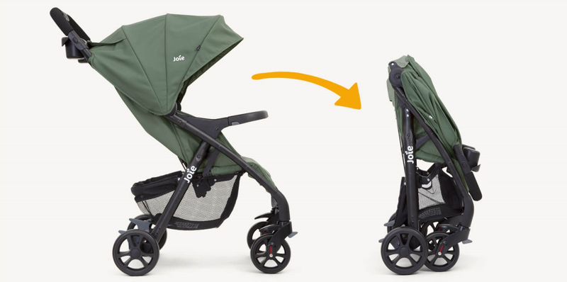 Автоматично заключване при сгъване фиксира количката в компактен пакет, подходящ за малки пространства