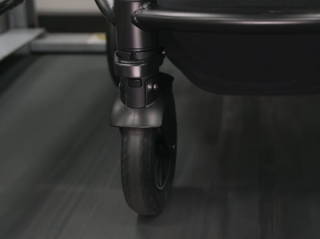 Предните въртящи се и настрани колела се заключват с натискане на бутон, за да се плъзгат лесно по неравен терен