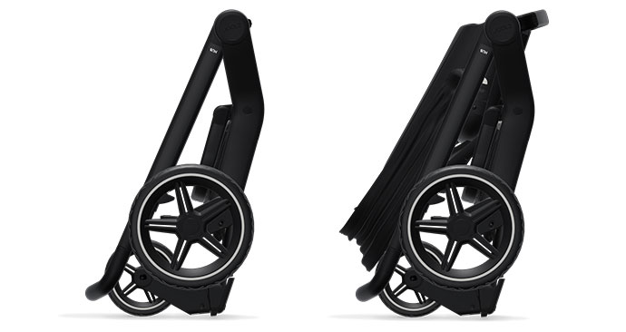 Компактно сгъване със седалката (независимо в коя посока е монтирана) и удобна презрамка за носене на рамо.