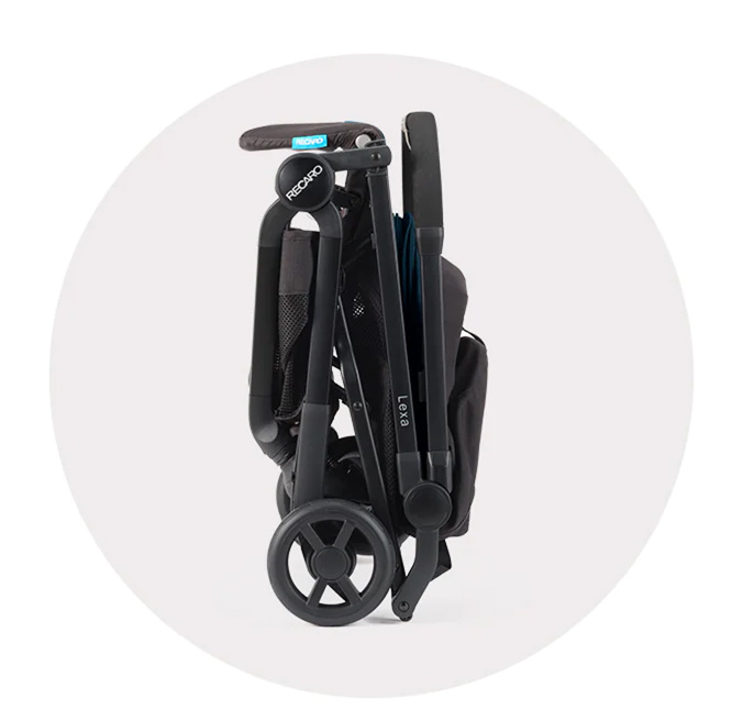 Сгъването е лесно и бързо, само с една ръка. След сгъване количката е самостоятелно стоящ пакет с компактни размери, удобни за транспортиране и съхранение.