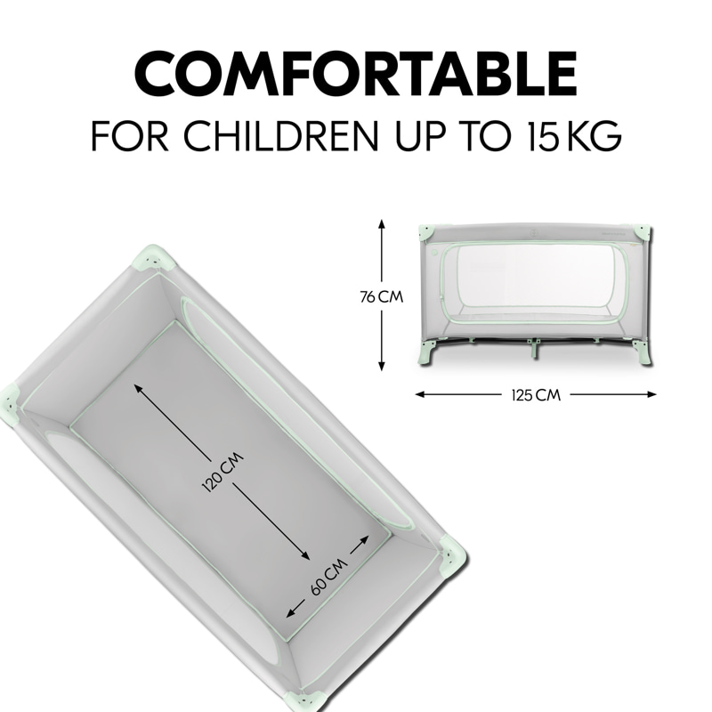 Пътуващото легло Dream N Play Plus осигурява сигурност в стилен и вечен дизайн за вашето мъниче (до 15 кг) и е идеалното място за игра навън или у дома, използвано като кошара за игра.