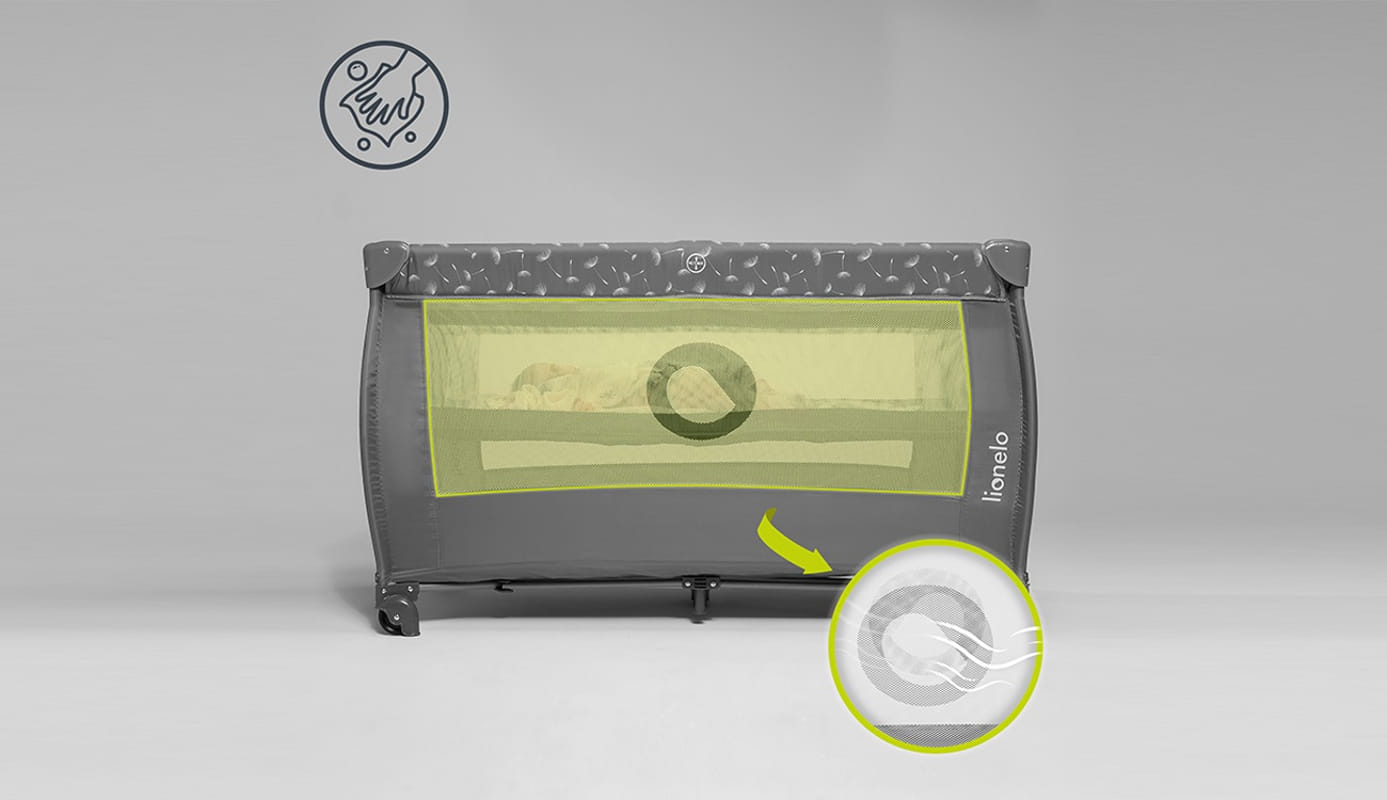 Леката, но стабилна стоманена конструкция гарантира сигурност, докато страничните мрежести стени осигуряват постоянна циркулация на въздуха. Двете колелца позволяват лесно преместване, така че леглото може да се използва навсякъде. Любимите играчки и аксесоари могат да се съхраняват в удобния страничен джоб, винаги под ръка. Повдигнатата основа изолира детето от студения под, а страничният вход с цип е идеален при използване като кошара за игра. Калъфът може лесно да се почисти при нужда.