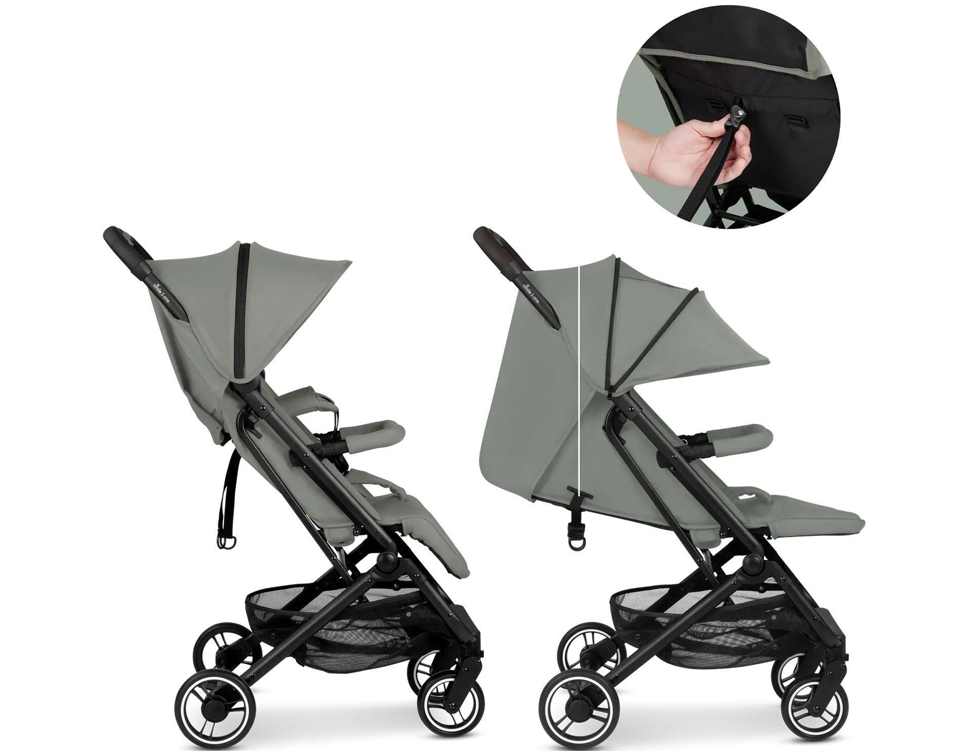 Облегалката се регулира плавно до напълно легнало положение, така че детето да може както да седи удобно, така и да спи спокойно. Дълбокият сенник с UV защита 50+ осигурява оптимална слънцезащита, а окачването на задната ос гарантира гладко возене дори по неравни терени.