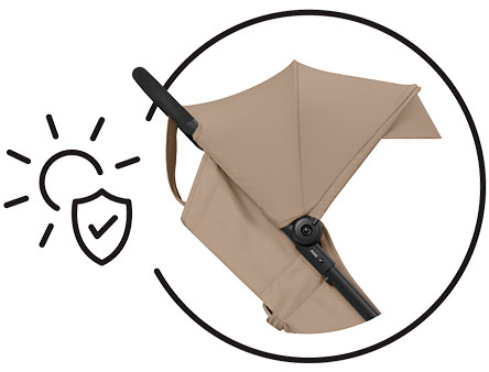 Пазете детето защитено с удължаващия се сенник UPF50+, докато вентилационните отвори в облегалката го охлаждат. Козирката осигурява допълнителна защита дори в най-слънчевите дни.