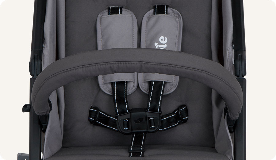 Покритият с плат предпазен борд предпазва любопитното дете, което обича да се навежда напред, докато изследва, като освен това се отделя, за да позволи на по-големите деца лесно да се качват и излизат от количката си