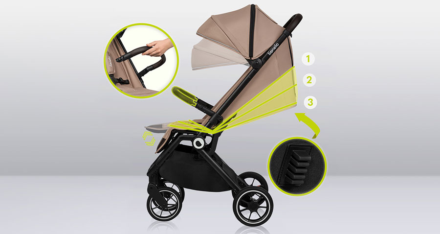 Можете лесно да сгънете количката Lionelo Cloe с една ръка. Можете също така да използвате системата за автоматично сгъване - с натискане на бутон количката ще се сгъне сама. Можете лесно да я поставите дори в малък багажник на кола благодарение на компактните ѝ размери след сгъване.