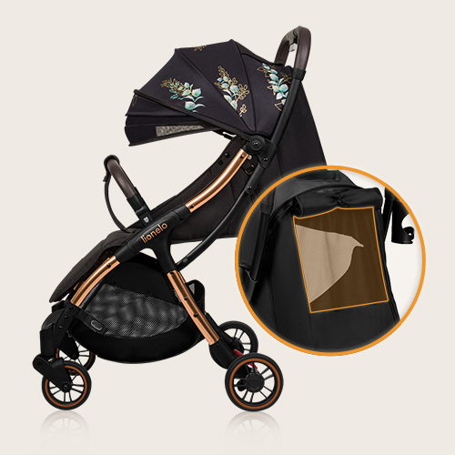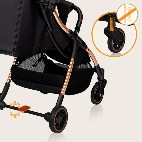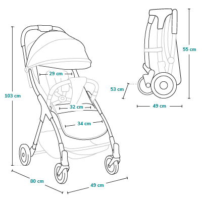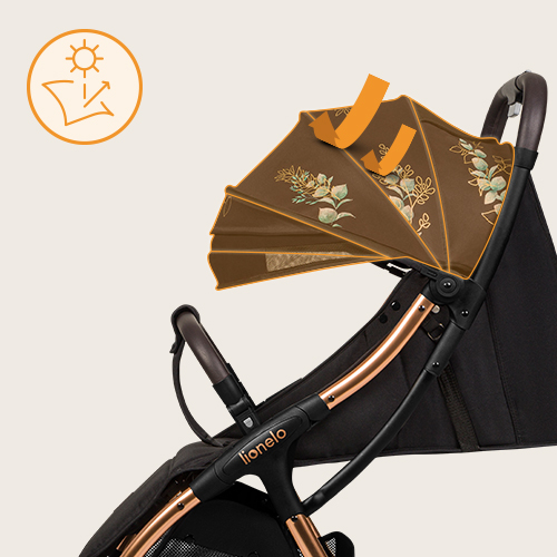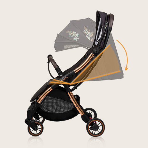 Регулируемият в 2 степени сенник и регулируемата поставка за крачета позволяват адаптиране към височината на детето и метеорологичните условия.