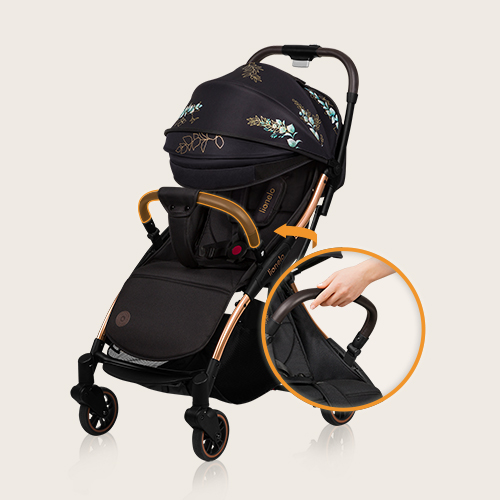 Предпазният борд се накланя, за да улесни поставянето и изваждането на детето от количката. Когато детето порасне, бордът може да бъде премахнат изцяло, за да осигури повече пространство.