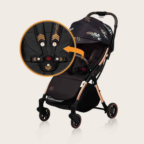 Безстепенното регулиране на облегалката позволява най-удобната позиция за детето – от седнало до напълно легнало положение за сън. Облегалката се заключва автоматично само с едно леко издърпване на лентата.