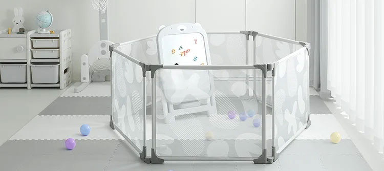 Иновативна ограда за безопасни игри и изследване. Тя създава сигурно затворено пространство, предназначено за бебета и малки деца, където те могат да се забавляват или да си почиват в безопасност.