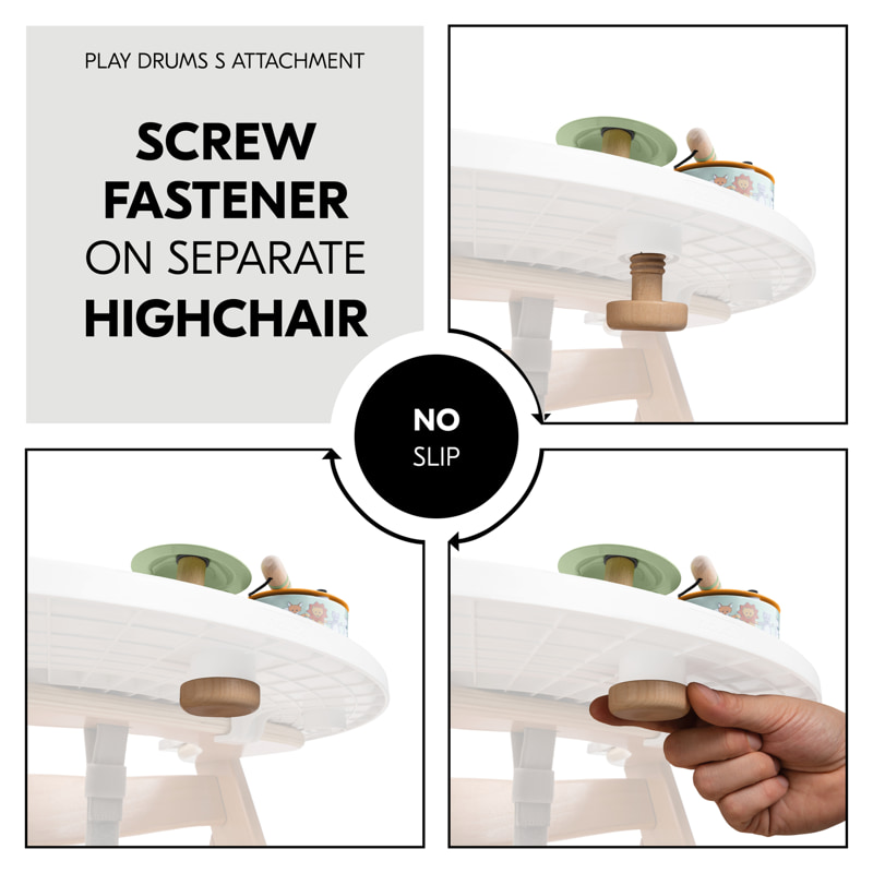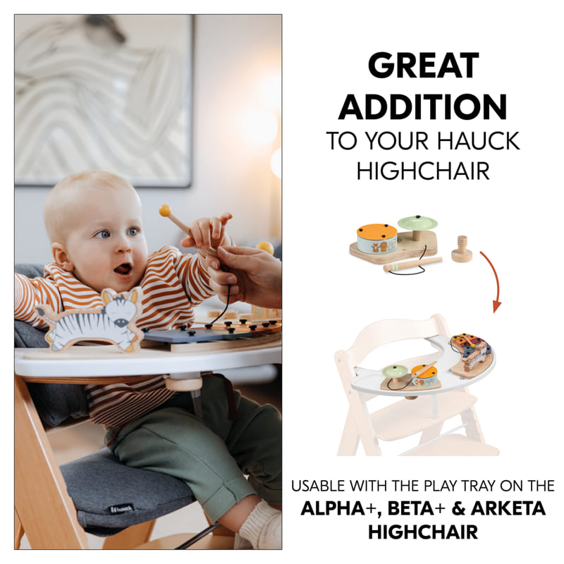 На столчето или на пода – с Play Drums S вашето дете може да играе навсякъде. Работи еднакво добре както с, така и без таблата Hauck Play Tray.