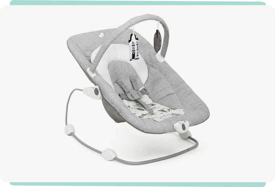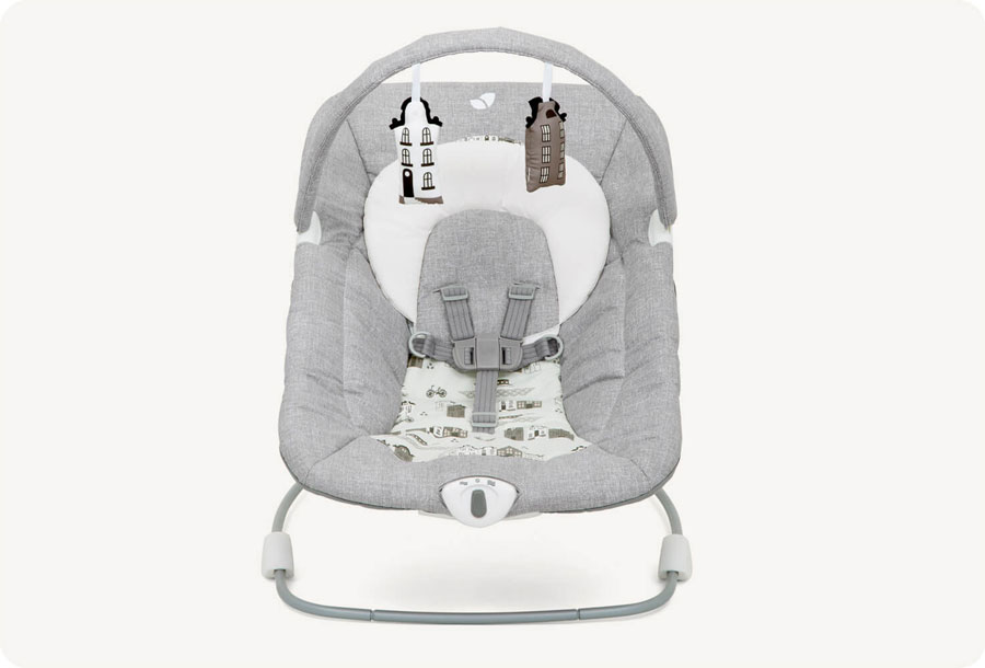 Лек шезлонг с успокояващи вибрации, който държи бебето комфортно и в безопасност.