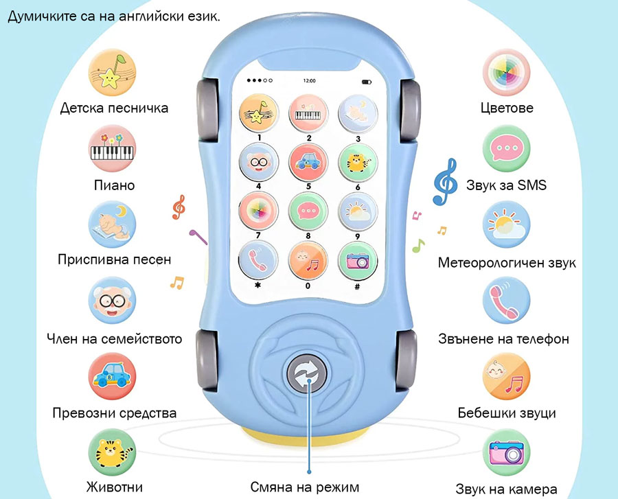 - Страхотна играчка 2 в 1 - кола за игра и бебешки телефон с няколко режима с различни песнички, думички (на английски) и звуци.