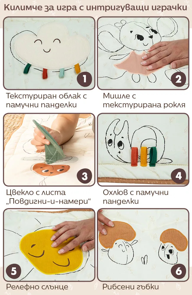 - Мекото бебешко килимче стимулира сетивата, когнитивното развитие и двигателните умения на бебето;
