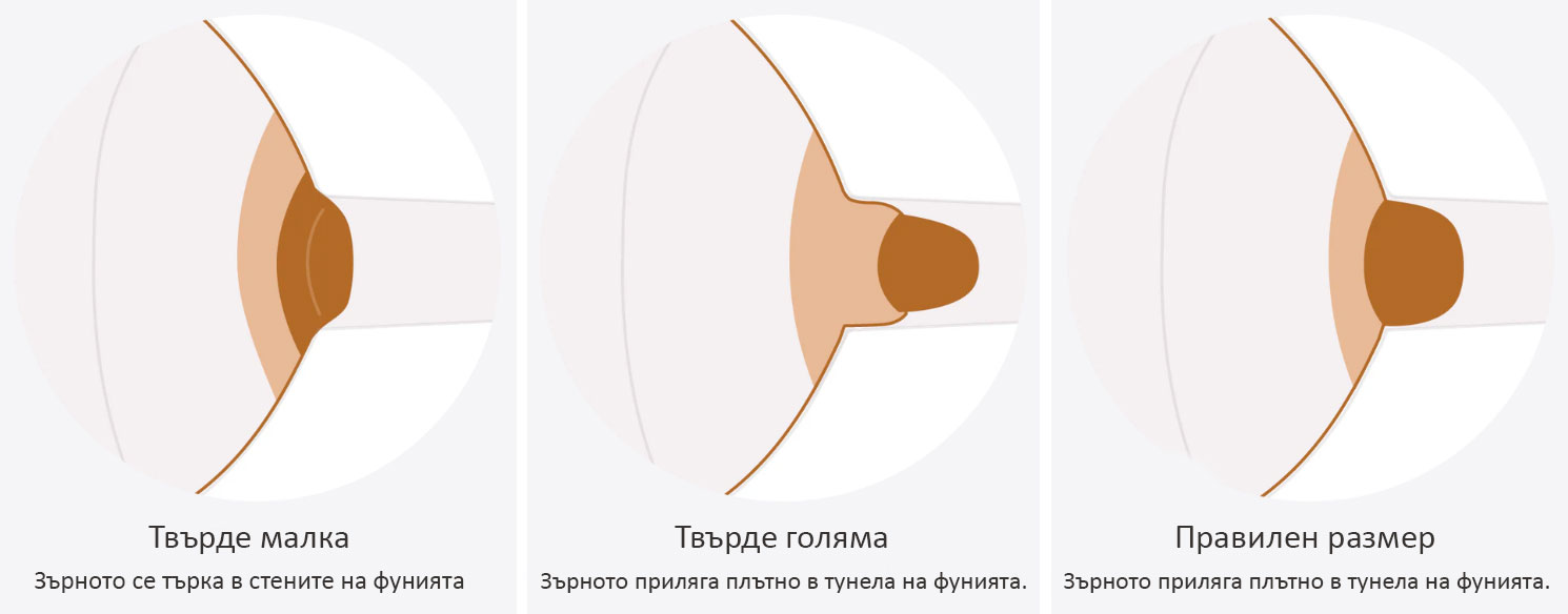 Зърното ви трябва да приляга удобно в тунела на фунията, без да се търка по стените или да се прищипва. То трябва да бъде разположено свободно и центрирано, а ареолата (тъмната зона около зърното) не бива да бъде всмуквана в тунела.