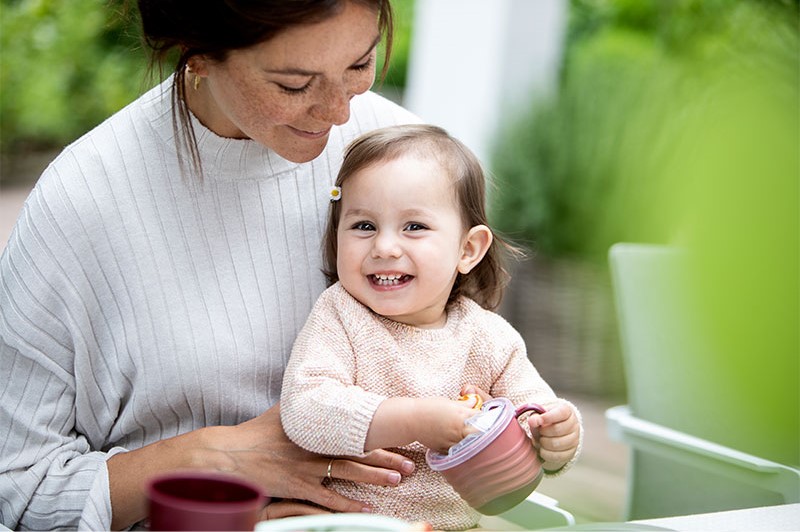 Чашата за закуски се предлага с допълнително капаче за хигиенно, безпроблемно транспортиране без никакви трохи. След като детето се нахрани и капачената биват остранени, чашата може да се използва като нормална такава - за пиене.