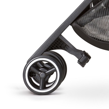 Двойните колела на Pockit + All-Terrain увеличават комфорта, позволявайки на родителите уверено да маневрират по различни повърхности.