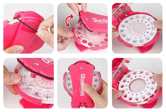 Машина с 5 шаблона със скъпоценни камъчета, с които може да се декорира коса или различни видове аксесоари. Просто поставете желания шаблон и изберете обект за декориране, след което натиснете, за да залепите бижуто.