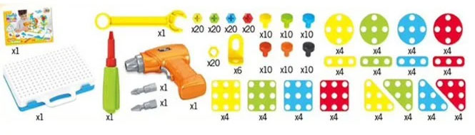Пъстроцветна мозайка, с която детето ще твори на воля! Комплектът се състои от куфарче, в което се побират всички части, а горната му част е поле за нареждане на мозайката. Мозайката може да се сглобява с работещия винтоверт или с включените инструменти (отвертка, гаечен ключ).