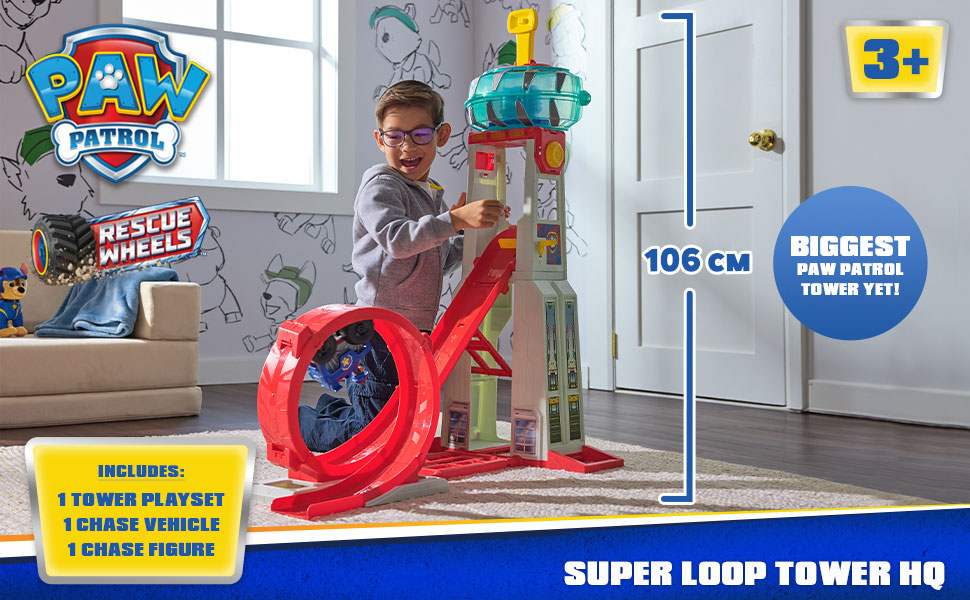 Пригответе се за вълнуващи високоскоростни спасителни мисии с Чейс и неговия чудовищен полицейски камион с големи колела в изцяло новата писта кула PAW Patrol: Rescue Wheels Super Loop Tower HQ! Тази впечатляваща кула е висока цели 106 см, със светлини и звуци, за още по-добро игрово изживяване. Тя разполага с 360 градусов лупинг за щури приключения!