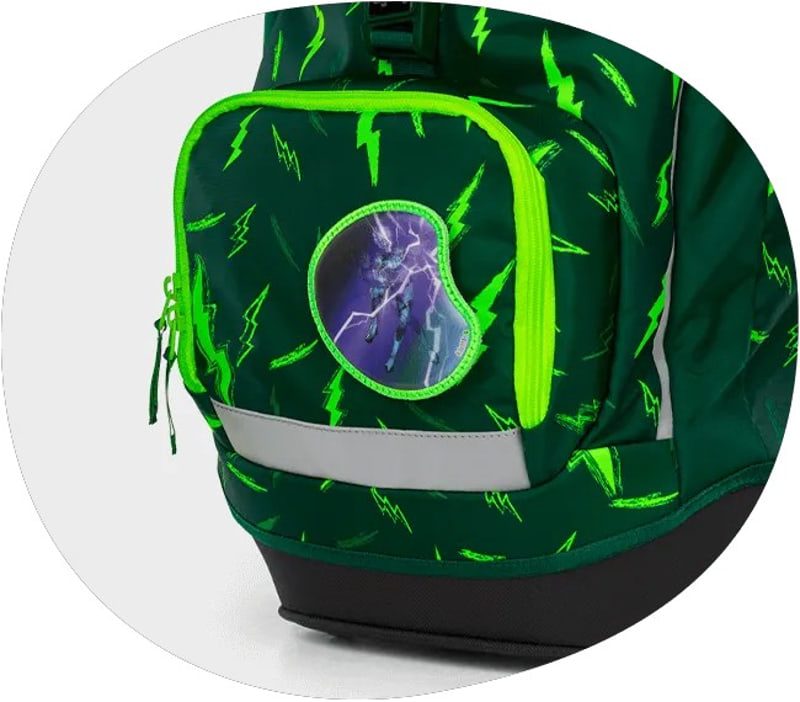 Ученическата раница е щедро оборудвана с отражатели от всички страни, за да бъде видима от всяка посока. Освен това могат да се добавят ципове в неонови цветове или с допълнителни отражатели.