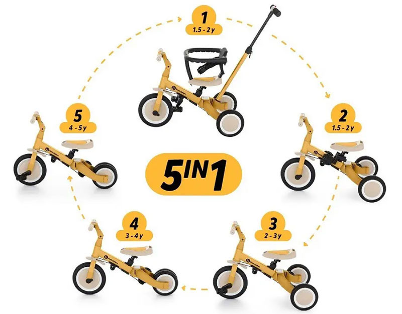 Добре обмислената трансформация на триколката се адаптира към нуждите на малкото дете с развитието на двигателните му умения. Първоначално това е триколка с възможност за помощ от родител, а финалната версия е стандартен велосипед с педали. Благодарение на тези промени в продукта, можете да помогнете на детето си уверено да се научи да кара на две колела.