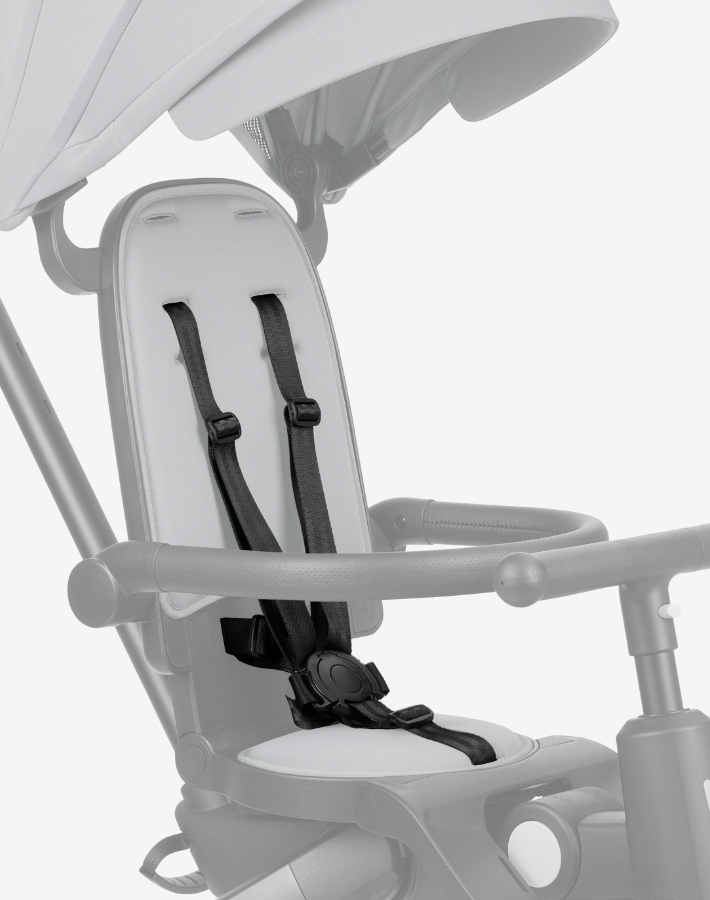 Оборудвана с 5-точкова система за обезопасяване и подвижен предпазен борд, триколката се грижи за безопасността на детето докато то се вози и забавлява.