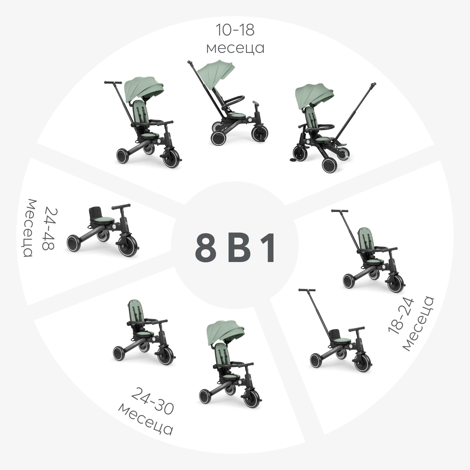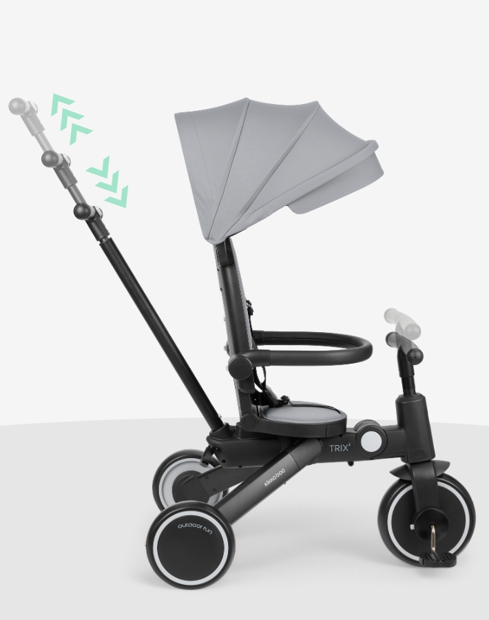 Готови ли сте за безкрайни приключения? TRIX 2 е иновативна и многофункционална триколка 8-в-1, която расте заедно с детето – от 10 месеца до 4 години. Съчетавайки гъвкавост, комфорт и безопасност, TRIX 2 предлага осем различни възможности за употреба, адаптирани към всеки етап от развитието на детето.