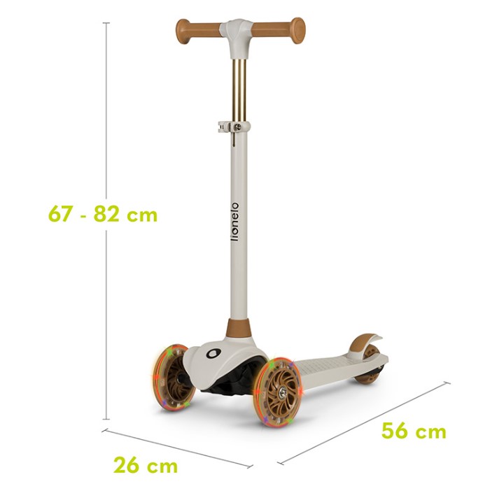 Трите здрави колела гарантират стабилност и сигурност, а удобните дръжки правят използването на баланс тротинетката Lionelo Jessy истинско удоволствие. Освен това LED светлините в колелата се активират при движение, добавяйки още повече забавление и цвят към всяко приключение.