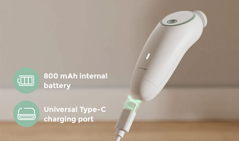 Електрическата бебешка пила за нокти Momcozy е с вградена батерия. За разлика от други бебешки нокторезачки и тримери, тази пила е презареждаема и ви спестява неудобството от смяна на батерии, като се зарежда лесно с обикновен Type-C кабел (разположен под кутията за съхранение).
