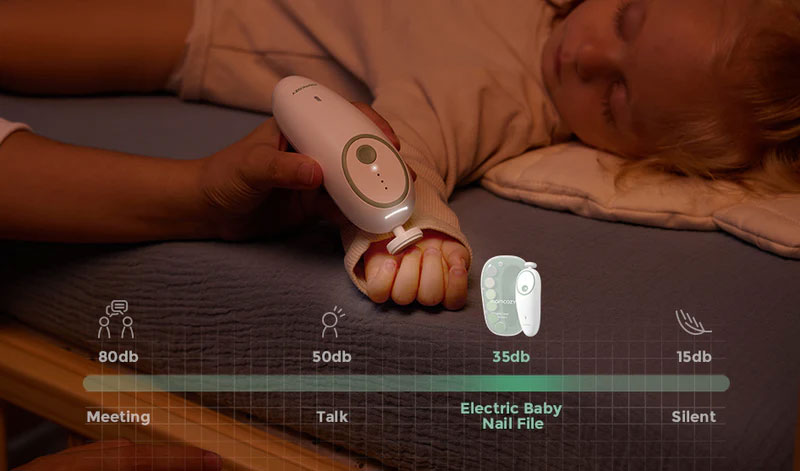 Бебешката пила за нокти на Momcozy е проектирана да работи с изключително ниско ниво на шум — под 35 dB при настройка на скорост 1. Тази почти безшумна работа поставя нов стандарт сред продуктите за грижа за бебета, тъй като минимизира всяко безпокойство и създава спокойна атмосфера за нежно и успокояващо изживяване.
