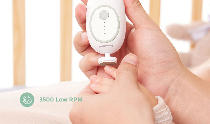 Шлифоващата глава на бебешката пила за нокти Momcozy спира автоматично при по-силен натиск, за да предотврати нараняване при случайно докосване на пръстчетата на бебето.