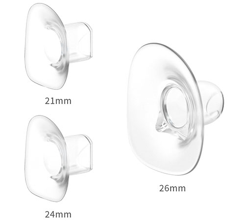 Основна – 26 мм (неразделна част от помпата за кърма) и 2 сменяеми фунии (21 мм и 24 мм). Благодарение на това можете да изберете най-подходящата фуния за вашето зърно.