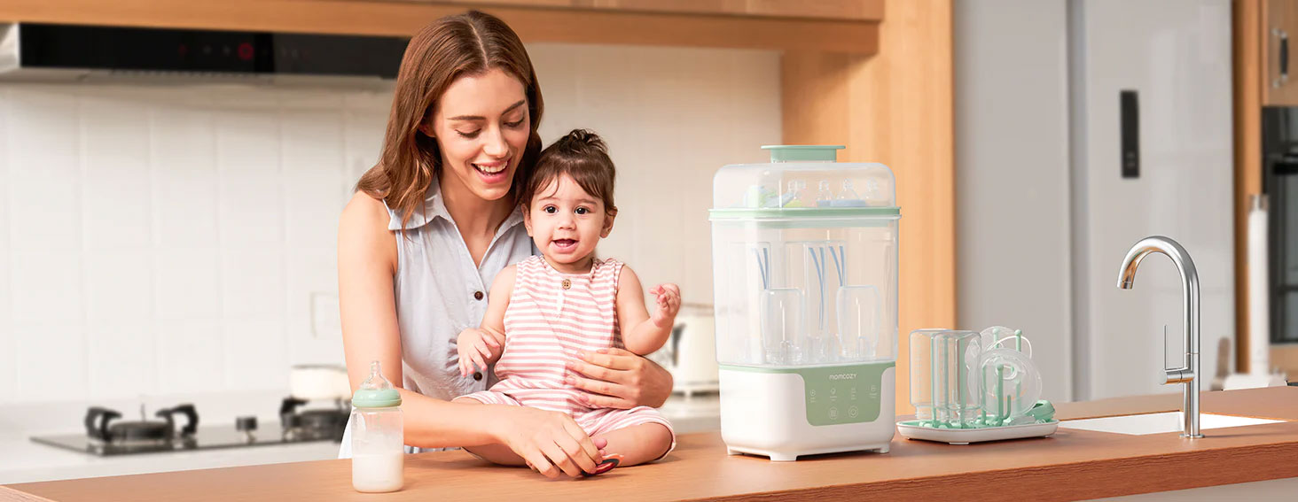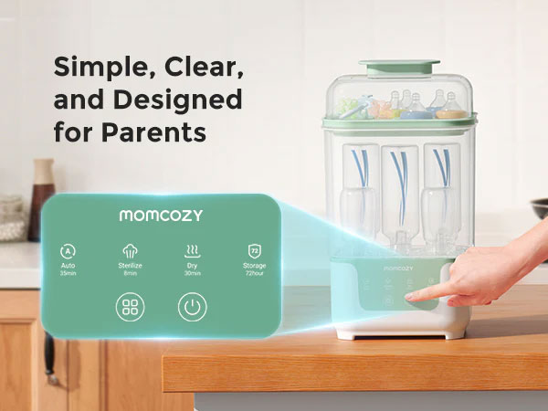 Поддържайте принадлежностите за хранене на вашето бебе чисти, сухи и винаги готови за употреба – без излишни усилия. Стерилизаторът и сушилнята за шишета Momcozy 4-в-1 съчетава стерилизиране, сушене, съхранение и автоматичен режим в едно елегантно и компактно устройство – създадено, за да ви спести време и да улесни ежедневието на новите родители.