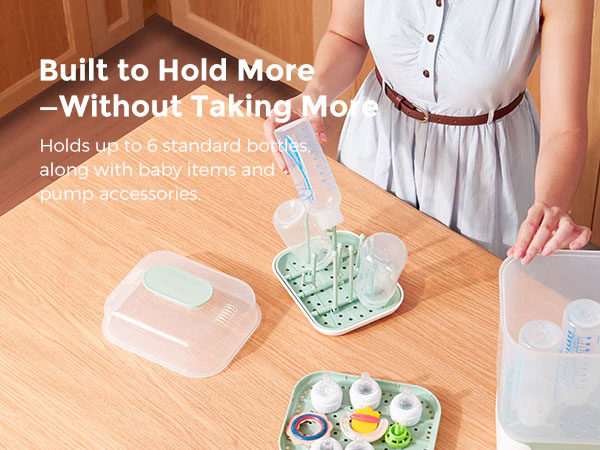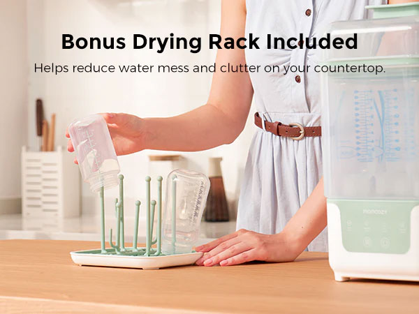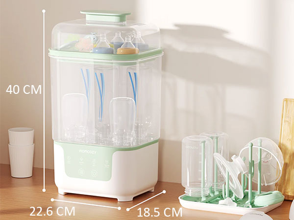 Стерилизаторът Momcozy е с 19% по-компактен от сходни модели, но побира до 6 стандартни шишета, както и аксесоари за новородено като биберони, части за помпа и играчки.