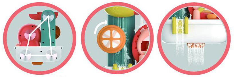 Закрепете играчката на гладка повърхност в банята (разполага с 4 здрави всмукателни чашки). С включената чашка сипвайте вода в горната част и прозорчето ще се завърти, а отдолу ще потече водопад.