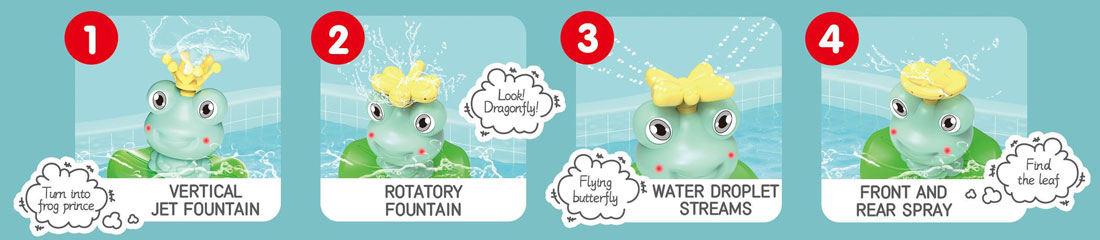 Сложете един от накрайниците на главата на жабката, след което натиснете бутона в задната част веднъж за задействане на струята, втори път за усилване на струята и трети път за изключване. Жабката плува и се върти на 360 градуса, а всеки от накрайниците ѝ пръска по различен начин: