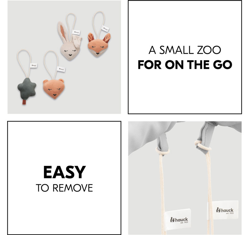Вашето бебе не иска да се раздели със сладките животни? Просто ги вземете със себе си! Можете лесно да ги премахнете от арката. Така че писукащите животни и дрънкалки правят разходката ви по-спокойна.